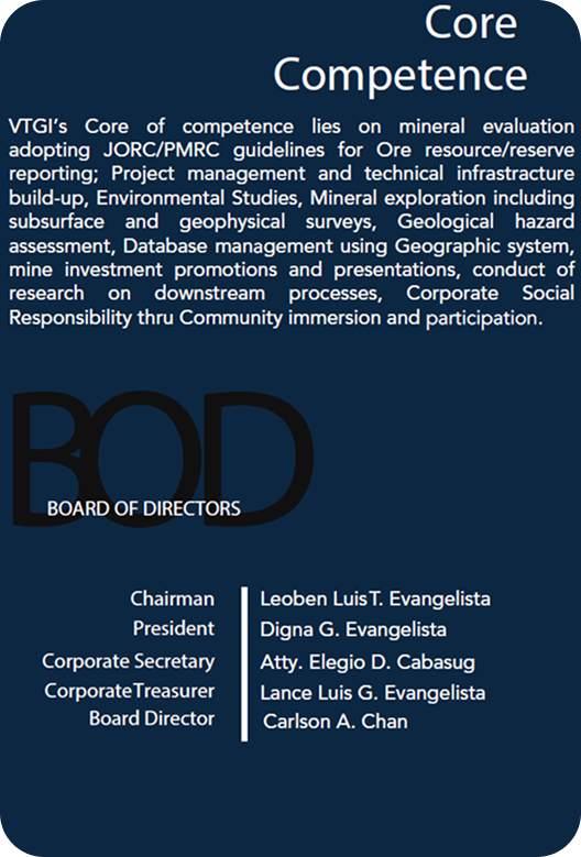 Envisioned to be a leading entity in providing excellent services in the field of mineral exploration and development. To establish it's own mining operations and excellently managing the four major component of the mining industry.